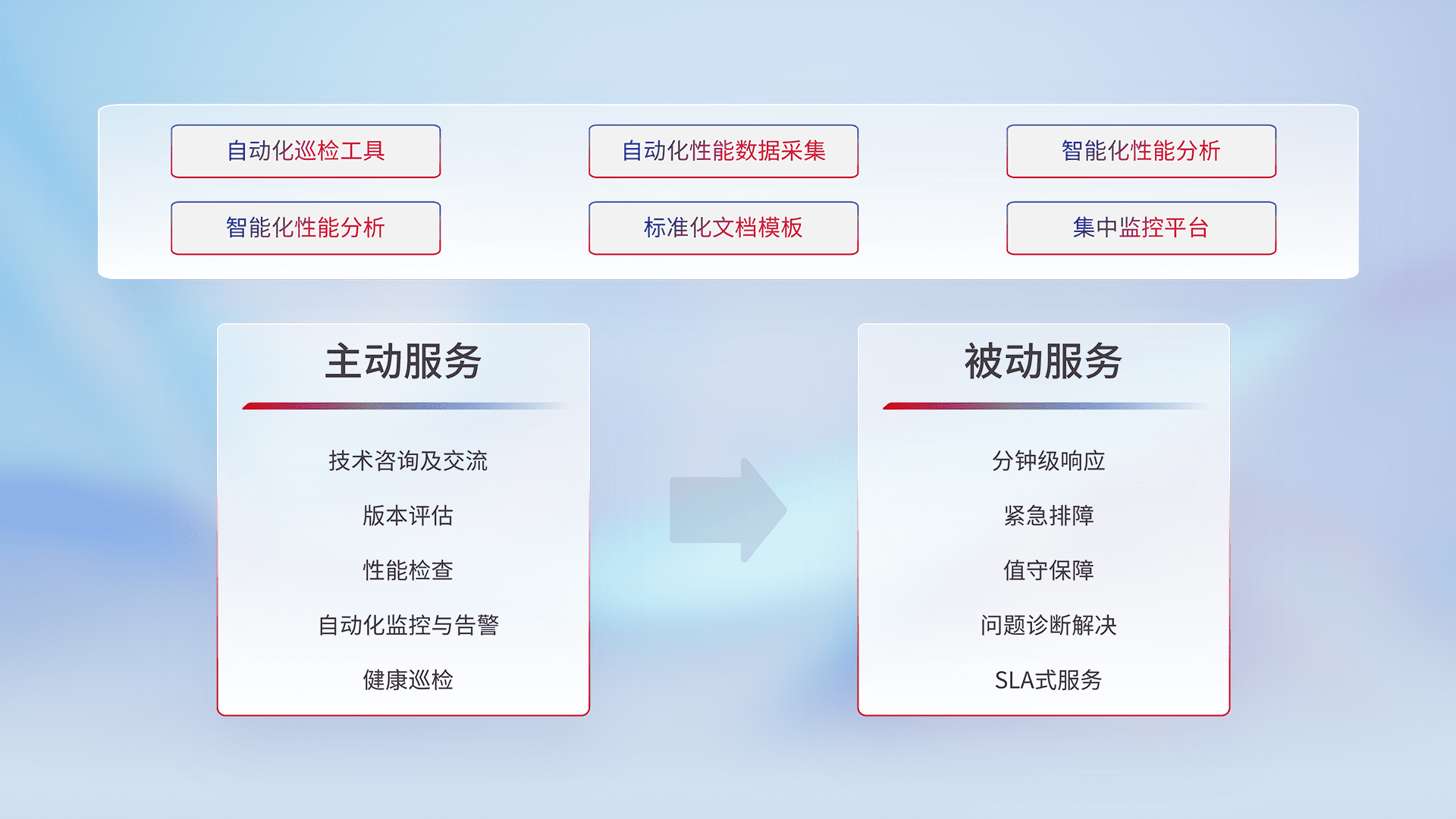 智能化工具和标准化文档,,,,保障服务质量,,,提供主动服务(包含技术咨询、、、版本评估、、、、性能检查、、、、自动化监控与告警、、、、健康巡检)和被动服务包含(分钟级响应、、、紧急排障、、、、值守保障、、、、问题诊断解决、、、、SLA服务)。。。